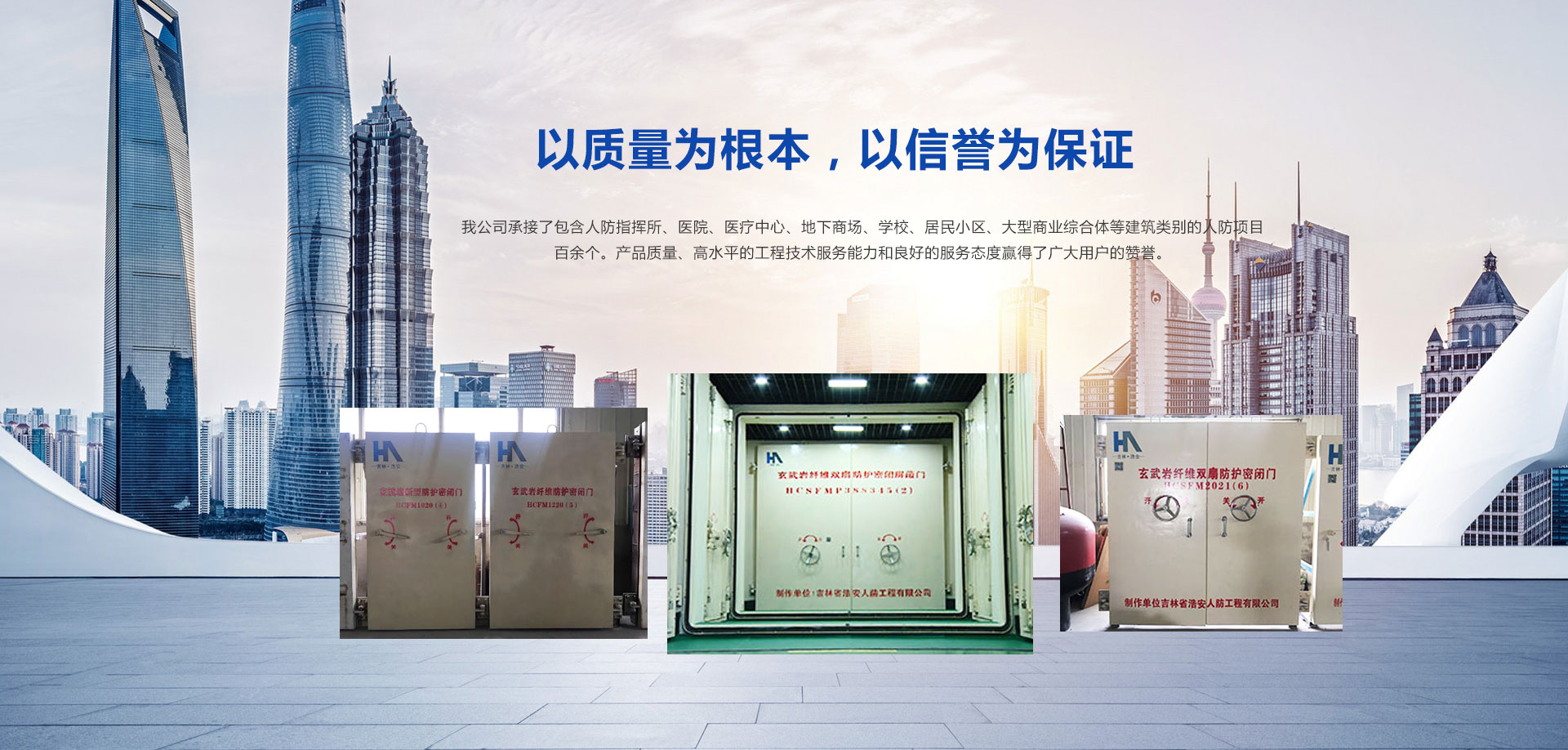 吉林省浩安人防工程有限公司是經國家人民防空辦公室批準成立的人防工程防護設備定點生產廠,2019年認定為國家級高新技術企業。本廠擁有現代化的廠房及先進的生產設備,集生產制造、質量控制、銷售服務為一體的區域性行業廠。公司座落在吉林省公主嶺經濟開發區,占地面積達10000平方米,辦公樓1200平方米,廠房建筑面積達6000平方米以上,注冊資金1000萬元,企業的技術力量雄厚,其中防護工程師,高級工程師及中高級專業技術人員占30%。青海分公司2018年10月15日成立,于當年11月26日通過 青海人民防空辦公室備案公示。 本廠經營的主要產品:連續玄武巖纖維新型人防防護門、鋼結構人防防護門、鋼筋混凝土人防防護門以及各種型號的通風設備和防化設備。本廠生產設備齊全,擁有雄厚的生產能力和技術水平,并嚴格按照國家相關標準生產和安裝。2015年5月15日正式開業至今,承接吉林省人防工程項目上百項,總施工面積超過百萬平方米。工程項目包含人防指揮所、醫院、地下商場、商場、學